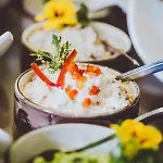 Πρωινό με μπουφέ προσφέρεται στους επισκέπτες του ξενοδοχείου στο εστιατόριο.